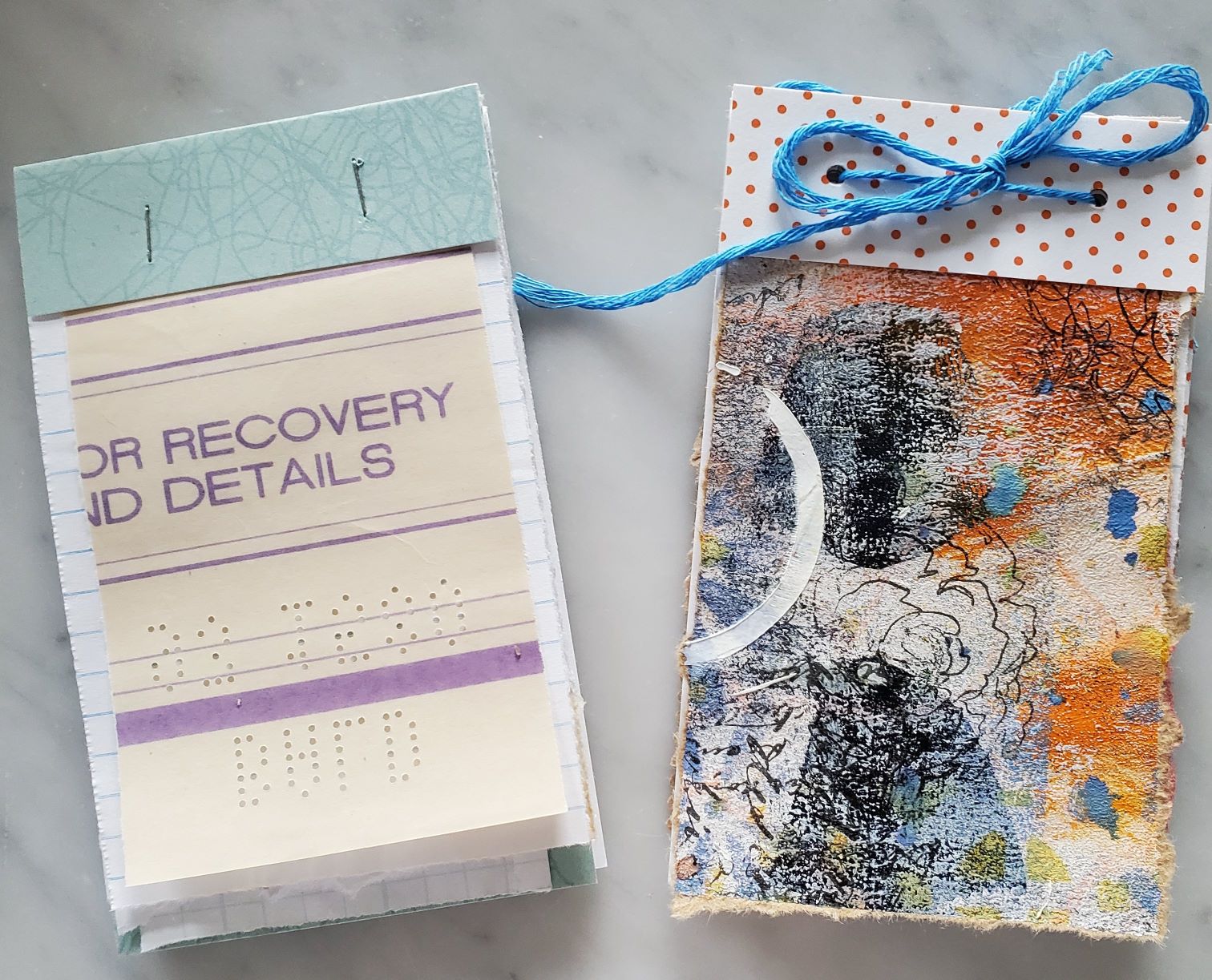 Bookmarks have an interesting cover with scrap paper underneath for note taking. The scrap paper can be replaced by untying the string!