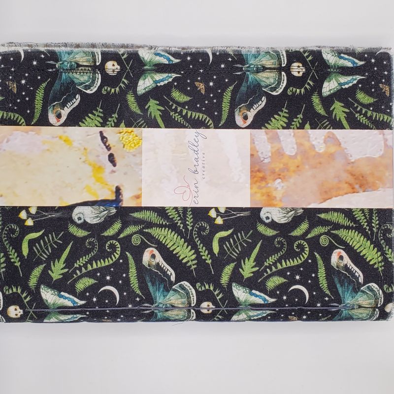 This handmade Moth Skulls Junk Journal Base features a soft cover made from designer fabric, providing a unique and tactile foundation for your creative projects. Each signature contains coffee-dyed papers, envelopes, and other found papers. Designed to be filled with your art, words, and embellishments, it offers versatile spaces to personalize and expand your journaling experience. Crafted with attention to detail, this journal base is ideal for artists and crafters seeking a distinctive canvas to showcase their creativity.